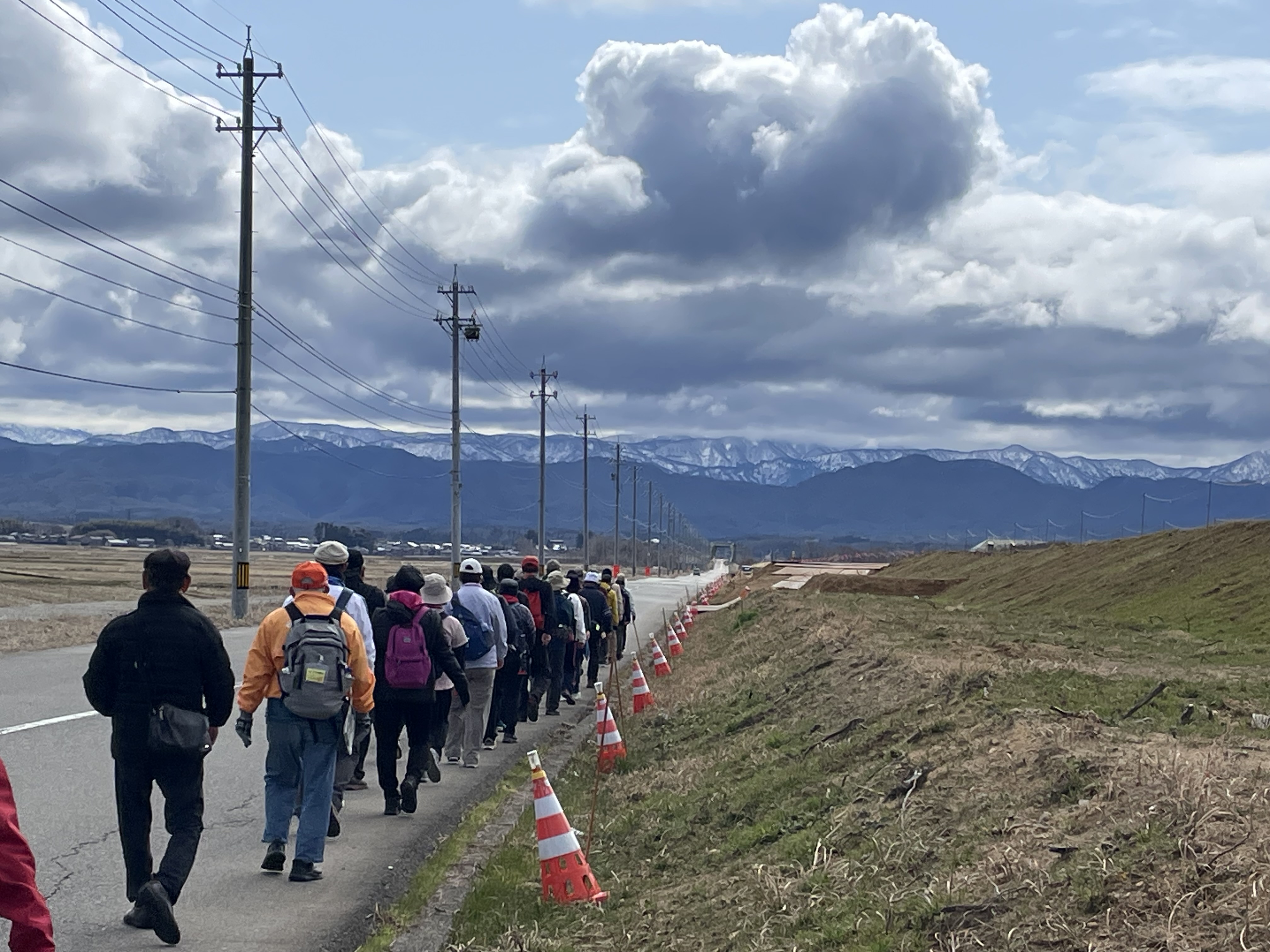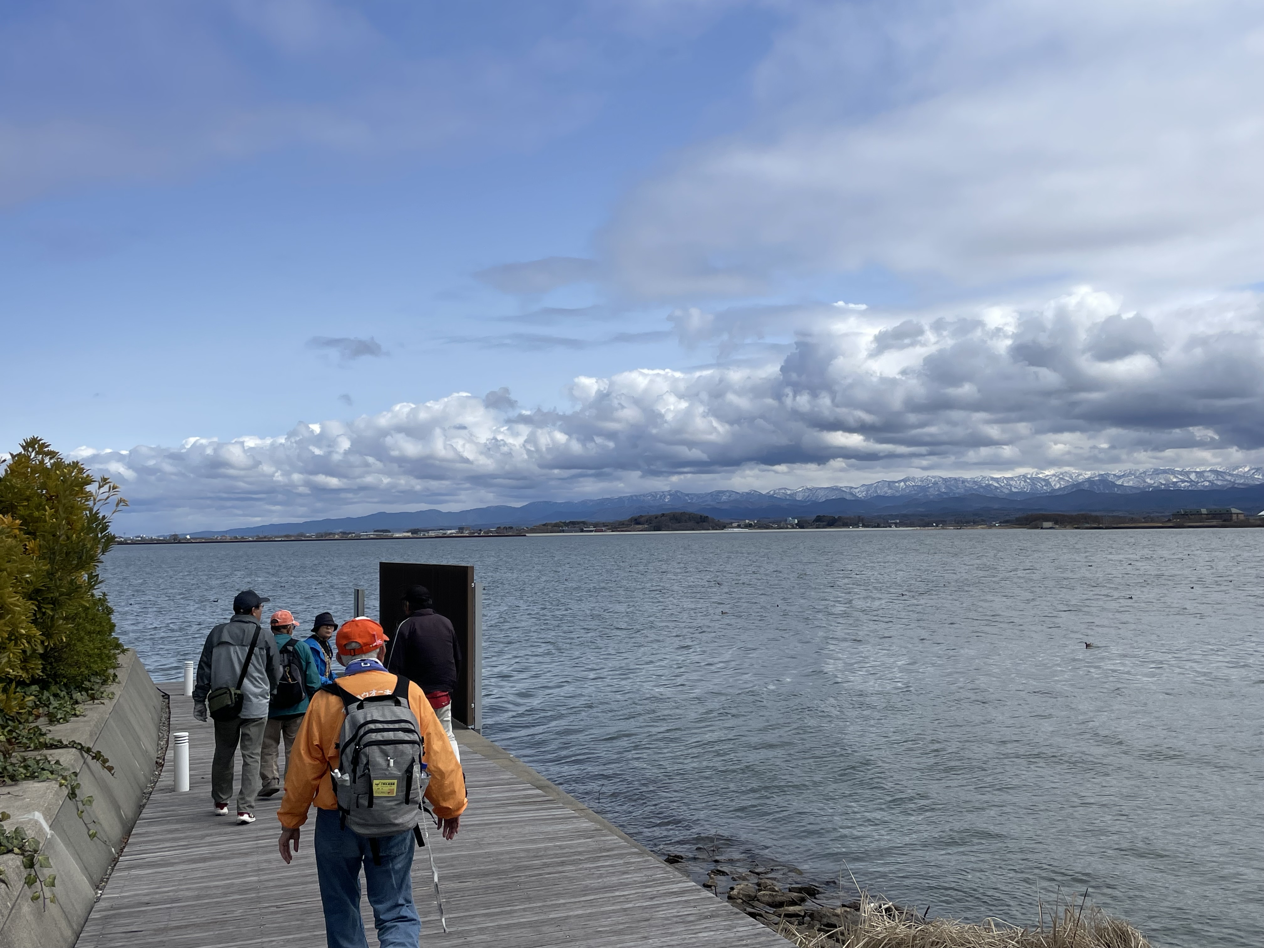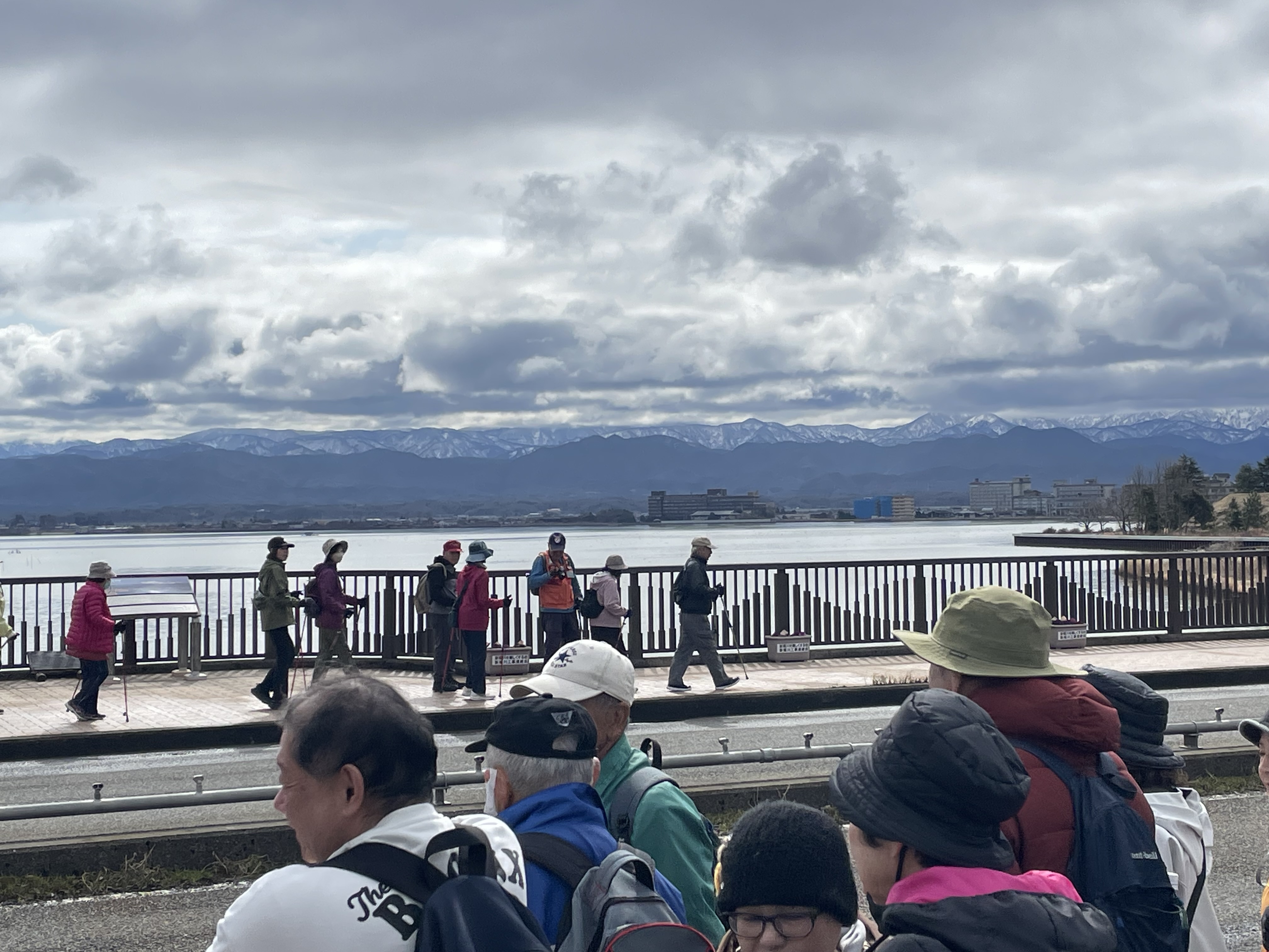 柴山潟一周ウォークが開催されました。雲の帽子をかぶった白山連峰を眺めながら、時折吹く冬の名残の寒風と、春到来を感じさせる陽射しの中、季節感あふれる11kmとなりました。